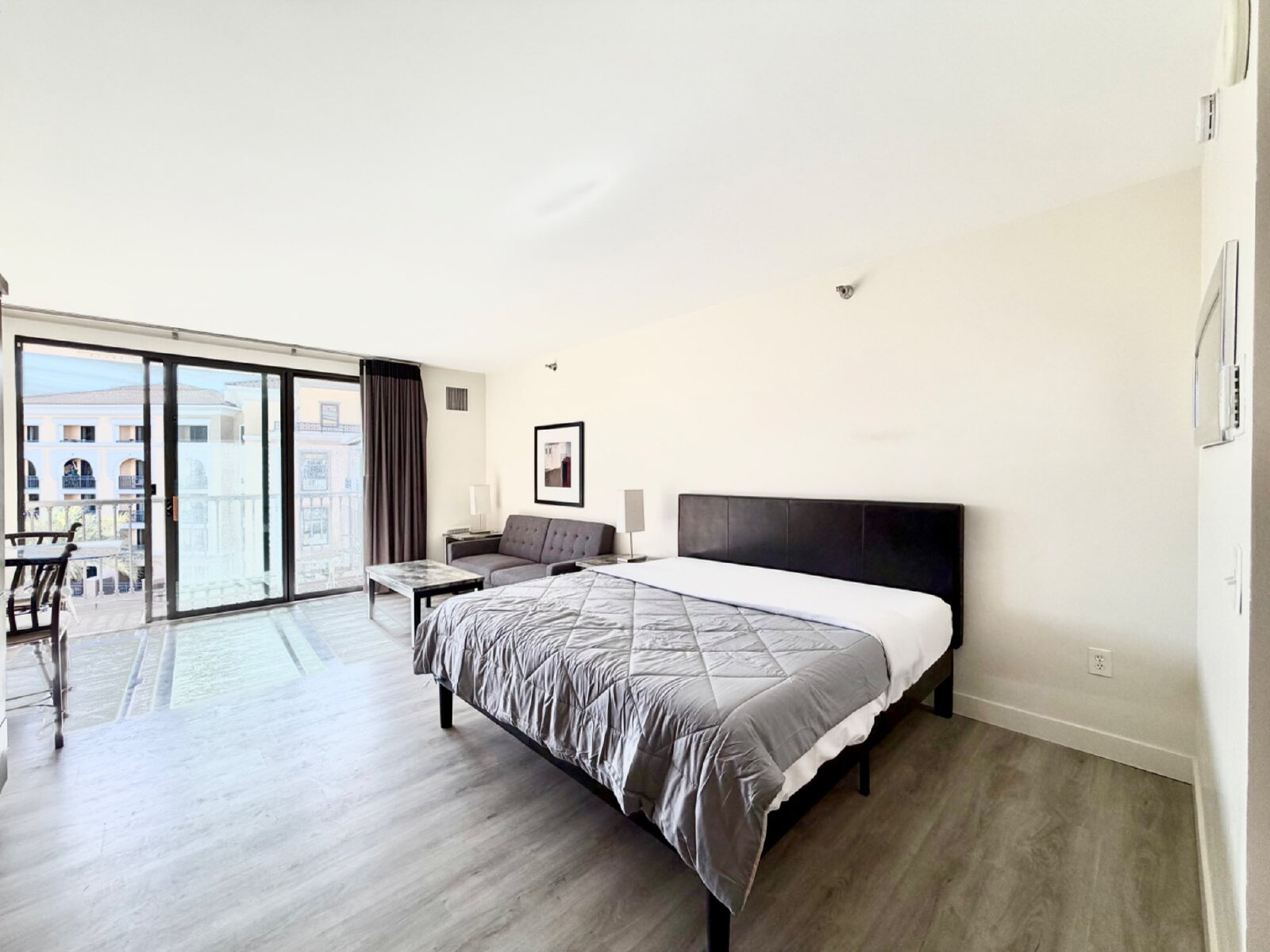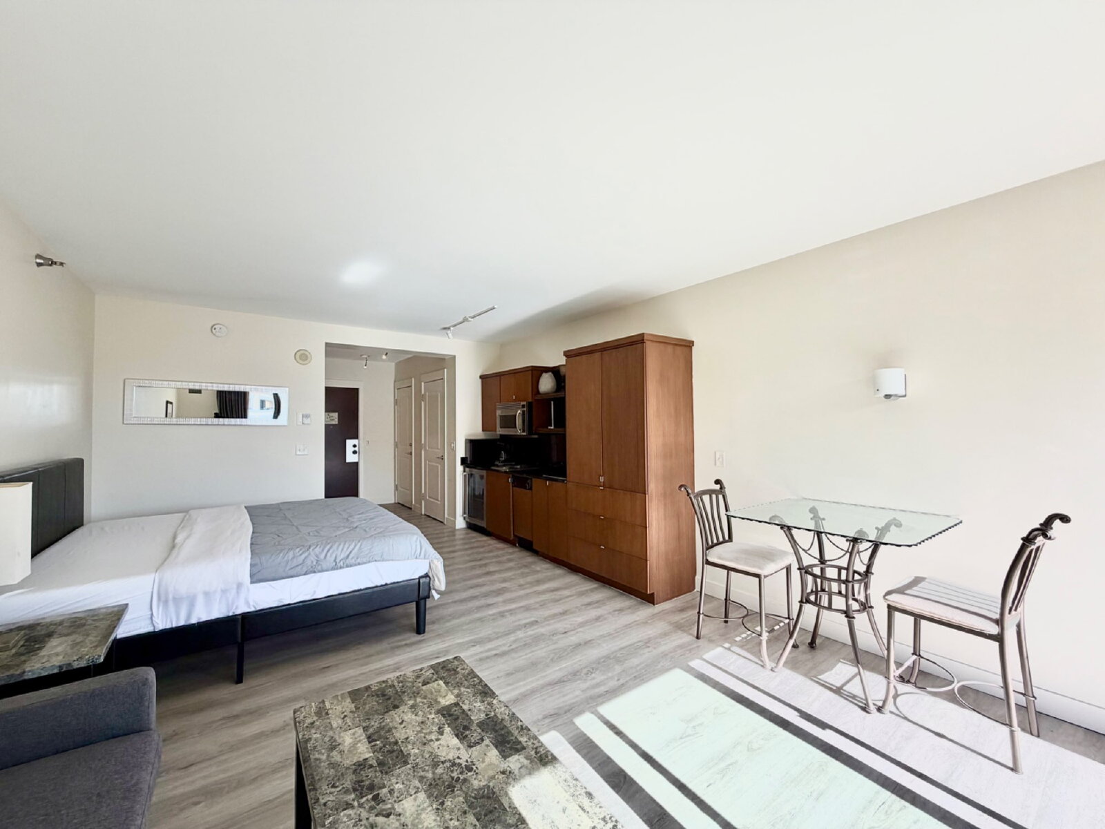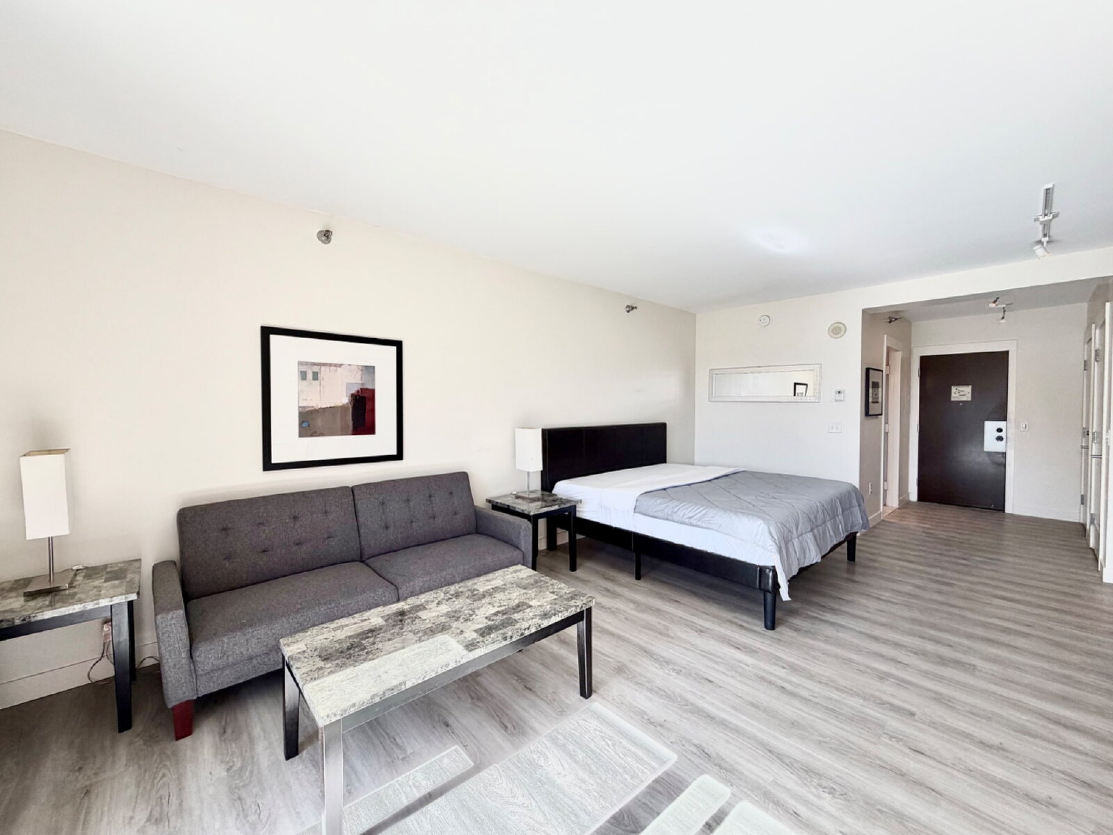 This thoughtfully designed studio offers curated furnishings with a versatile living and sleeping configuration, including a sleek convertible sofa for flexibility and comfort. All utilities are included, providing effortless living.
